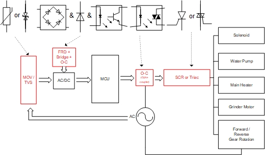 人们把电子技术应用到咖啡机上,实现了磨粉、压粉、装粉、冲泡、清除残渣等酿制咖啡全过程的自动控制,创造了全自动电子咖啡机。 应用于消费电子领域,百乐博blb微电 能提供比较齐全的元件解决方案。比如:AC 输入端防浪涌的压敏电阻(MOV)、电源部分用快恢复二极管(FRD, fast recovery diode)及整流桥(Bridge)、光电隔离器件(Opto-coupler)、控制负载通断的可控硅(SCR & Triac)等。
