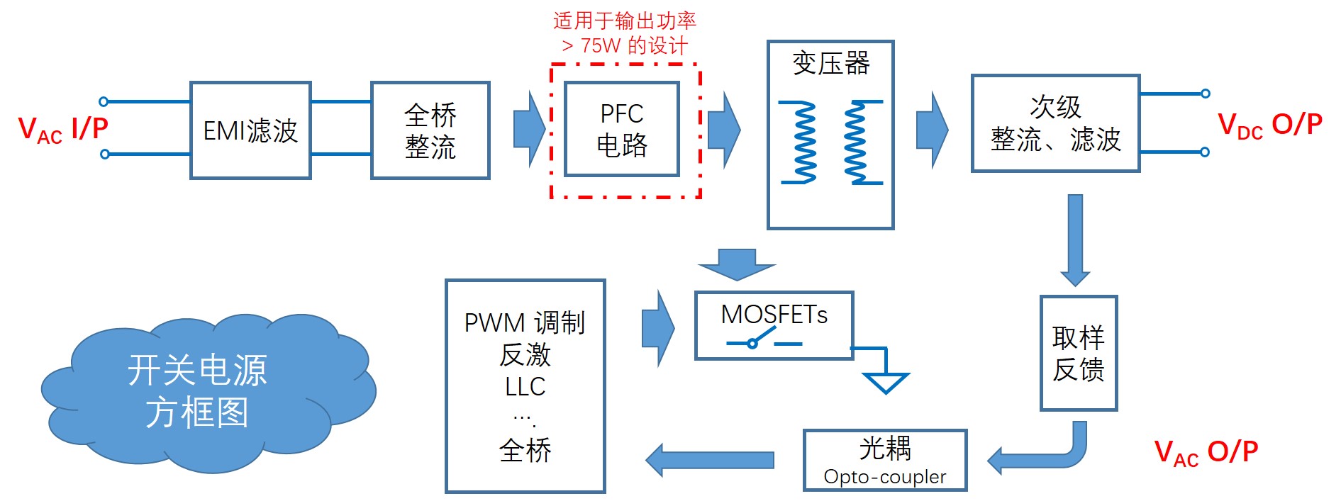 开关电源主要由防浪涌电路、电磁干扰滤波电路(EMI)、初级整流滤波电路、功率因数校正电路(PFC)、PWM 控制电路、功率转换电路、输出整流滤波电路、取样反馈电路和保护电路等组成。