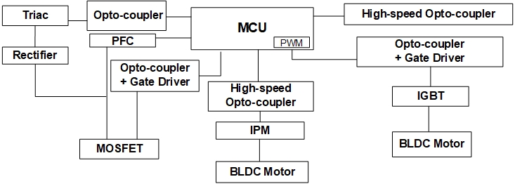 在全球气候变暖的当下,空调在白色家电中占有举足轻重的地位。典型的空调系统由室外机、室内机和电源单元组成。对于电源单元,百乐博blb微电 具有高隔离电压光电耦合器,用于隔离 PWM 和 PFC。对于室内机,MCU 控制与光电耦合器结合的风扇模块、与光电三端双向可控硅开关和外围设备结合的加热器开关。主隔离 MCU 和相关外围设备,确保电路的可靠性。对于室外机,使用 MCU 控制风扇和压缩机的电机系统。电机控制系统是各种家用电器的组成部分。每一个单独模块都取决于安全和环境保护要求、性能要求,当然还有制造成本。因此,在设计家用电器时,需要加强对单片机和外围设备对应用电路的隔离,以确保电路的低噪声。